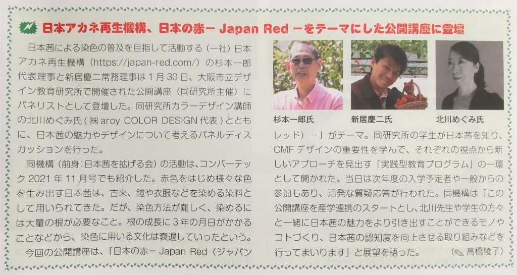 2022年3月15日 Tweet メディア 【掲載情報】コンバーテック 2022年3月号 「世界で唯一の加工技術情報誌」コンバーテックさん(発行元:株式会社加工技術研究会)の3月号に当機構の取組みが掲載されました。 今回は1月に開催されました日本茜の公開講座について掲載をしていただきました。 他企業様の環境技術やSDGsについての特集も掲載されていますのでご興味がある方はコチラをご確認ください。