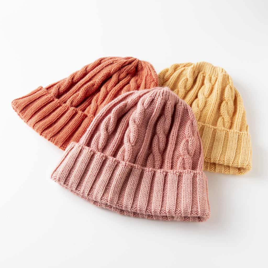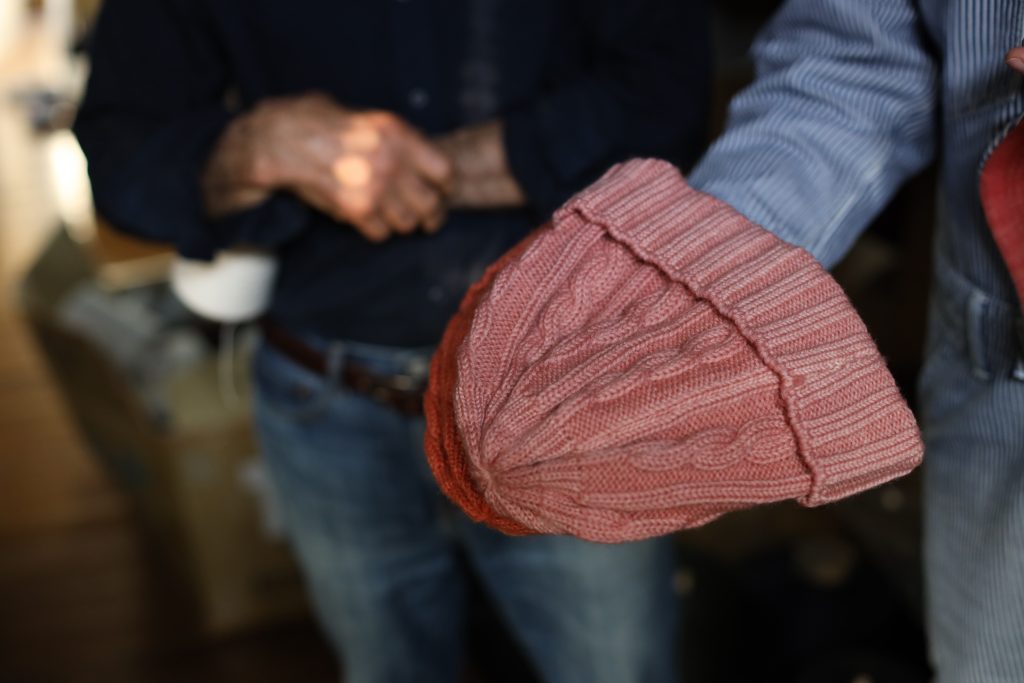 「この茜染めの糸で、なにか帽子をつくりたい」そんなおおまかなお願いも、大城さんはやっぱり「ほな、やってみよか」と、ご快諾。アラン模様に編み上げ、さらに後染めをすることで、なんとも奥行きのある個性的な表情がうまれました。