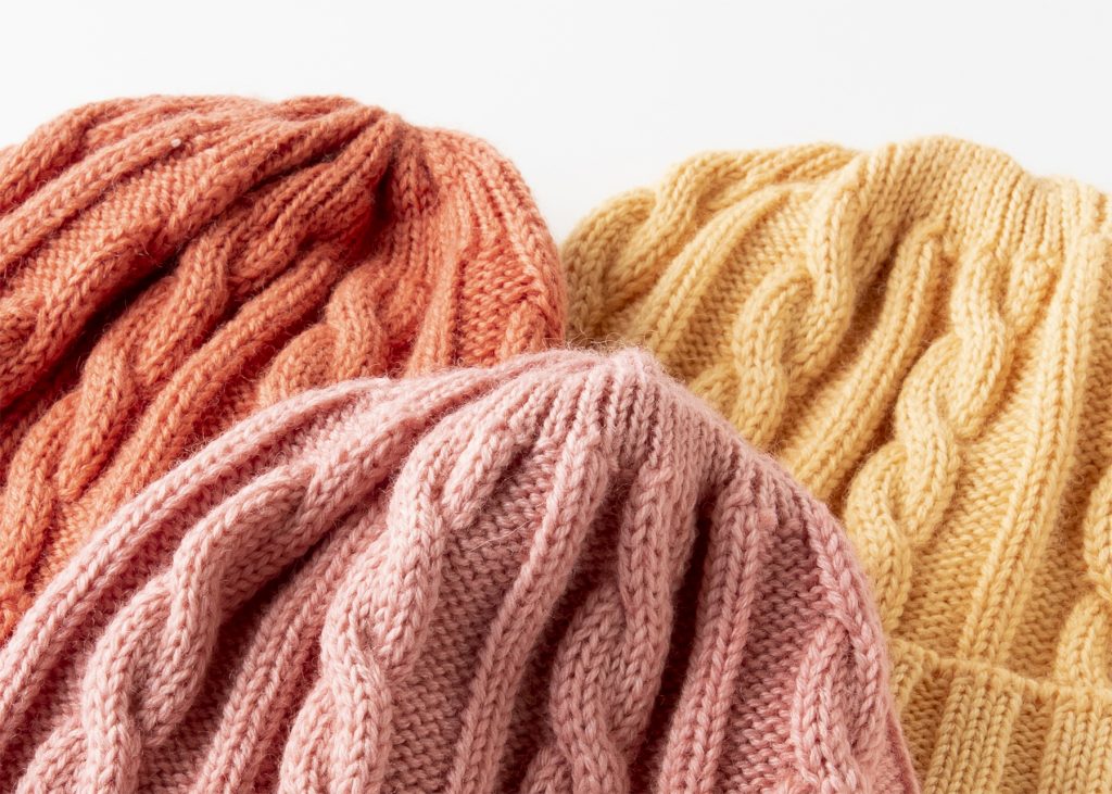 イエロー、オレンジ、ピンクまで、日本茜のポテンシャルが発揮されたニットキャップたち。