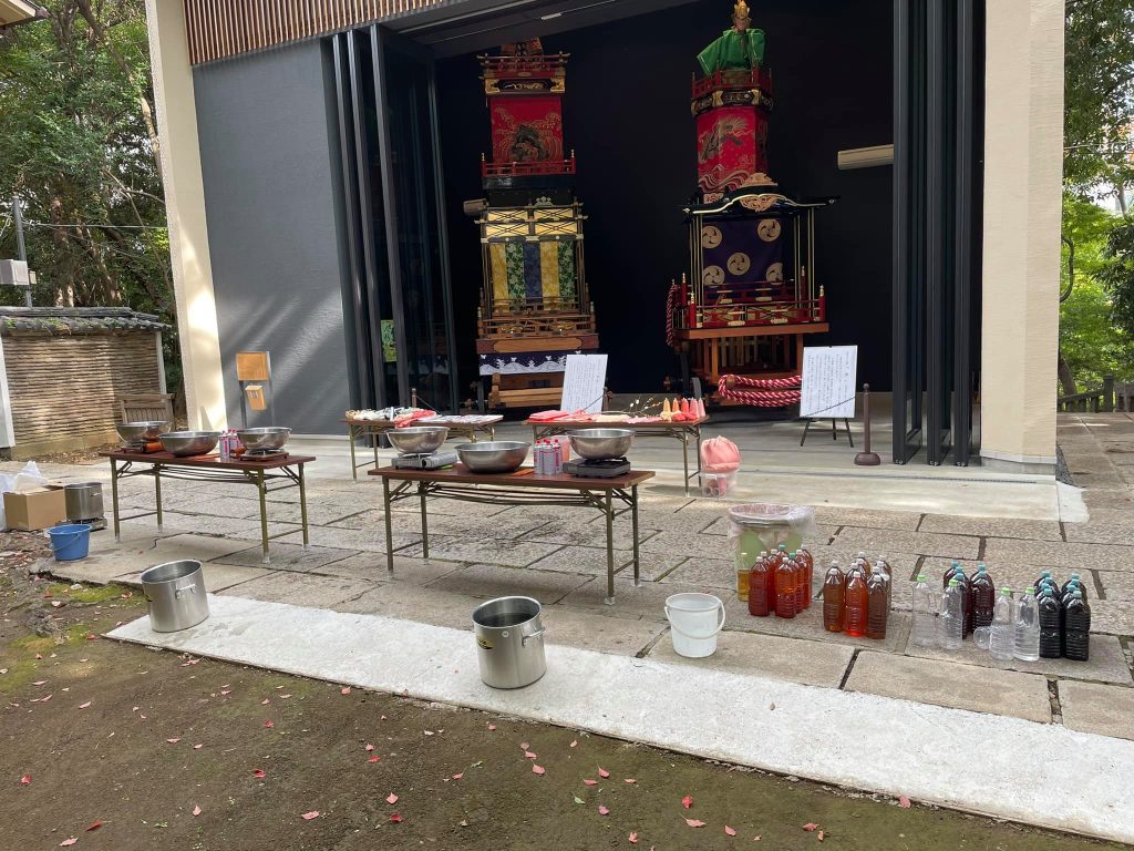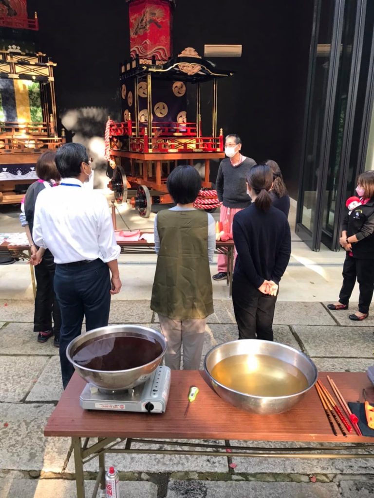 宮司さんの心意気で大変立派な宮神輿や山車の前で染色をさせていただくことができました。