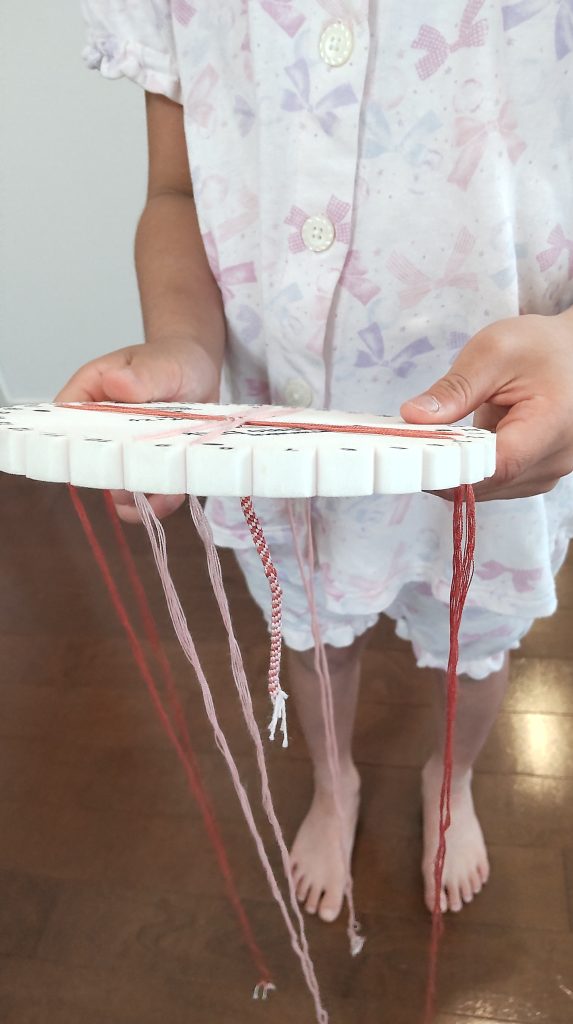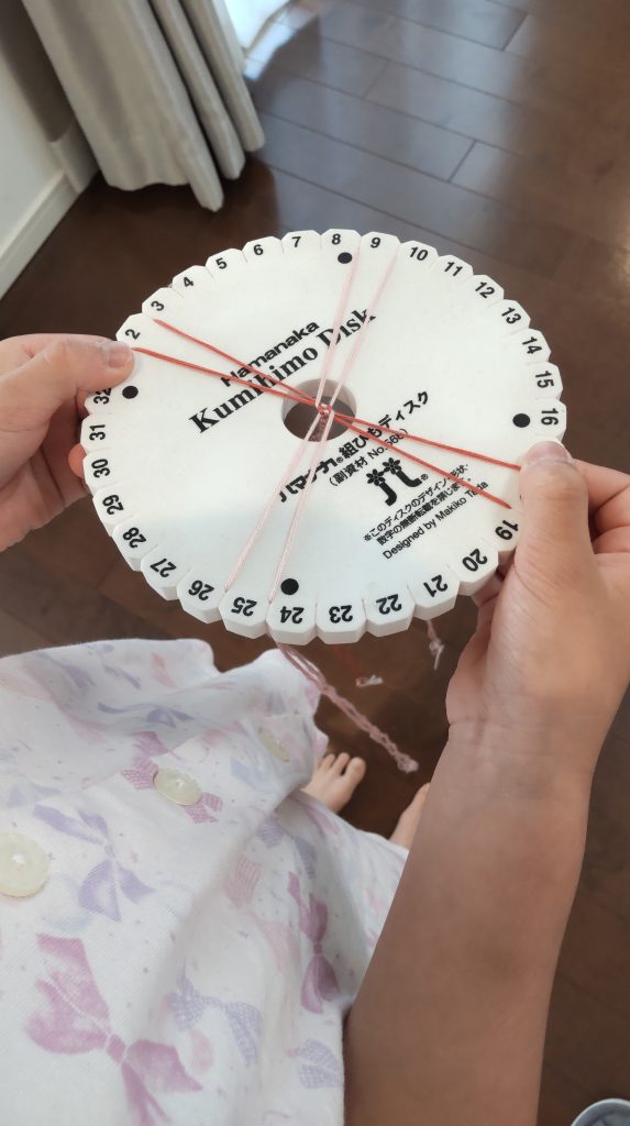 ワークショップでは日本茜で染色した絹糸で組紐作りをしました。