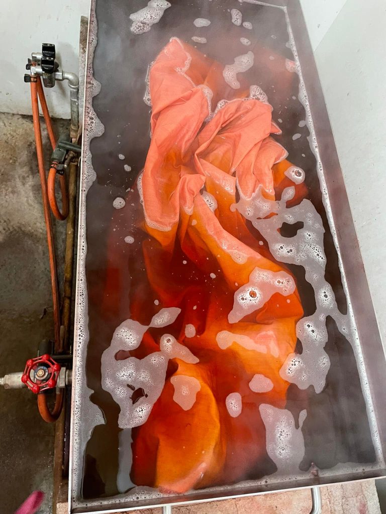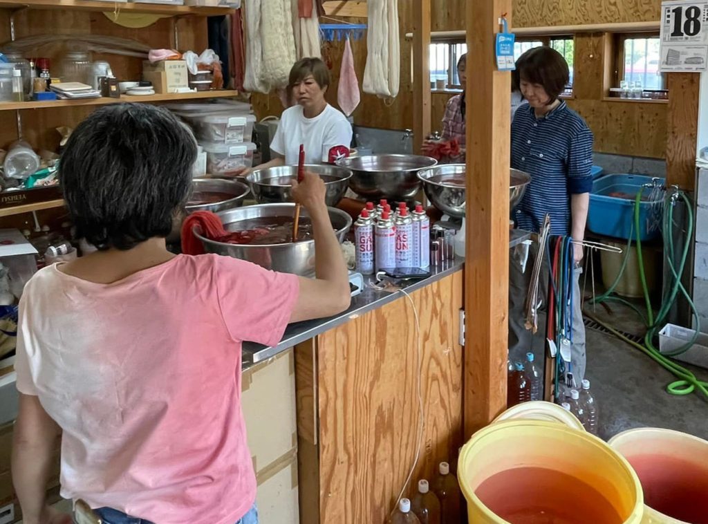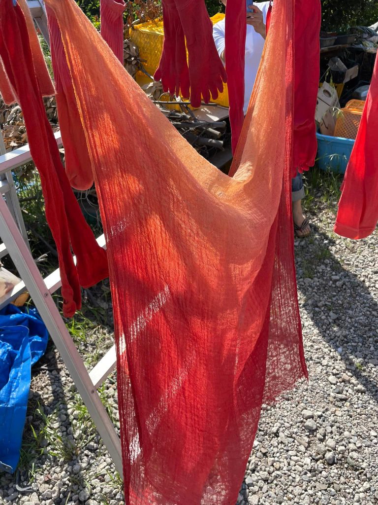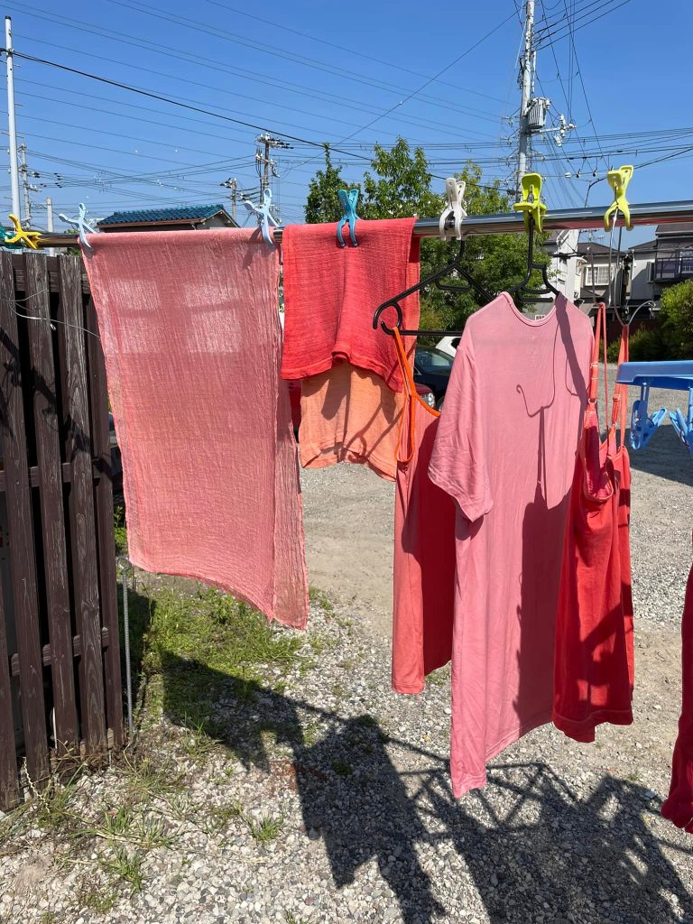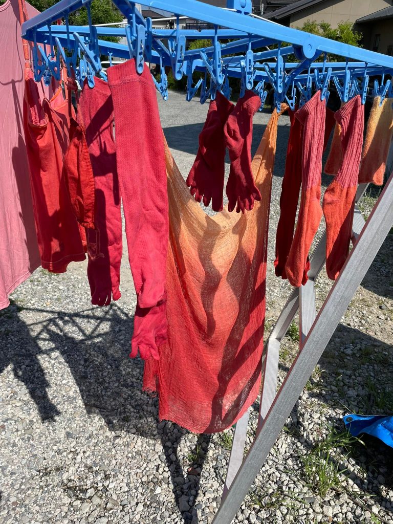 2022年5月20日 Tweet ワークショップ 日本茜 染色ワークショップ【2022.05.18】 5月18日に工房で4ヶ月ぶりに日本茜の染色ワークショップを行いました。出張でのワークショップでは出来ない程、時間も赤根もたくさん使いますので思う存分に日本茜の染色を体験することができます。 使う道具もプロ仕様ですよ♪ 皆さん思い思いの染色を楽しんでいます。 どれも上手に染められていますね☆とても美しい色に仕上がりました♪ 染物だけではなく、染められた皆さんの笑顔も凄く素敵です☆彡 染色が未経験の方やお一人様でも大丈夫ですので、ご興味がある方はお問い合わせください。