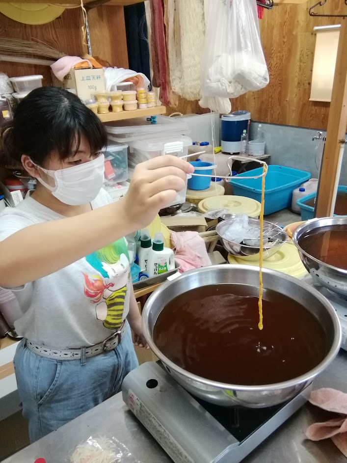 説明を受けた後には、日本茜の染色体験をしていただきました。