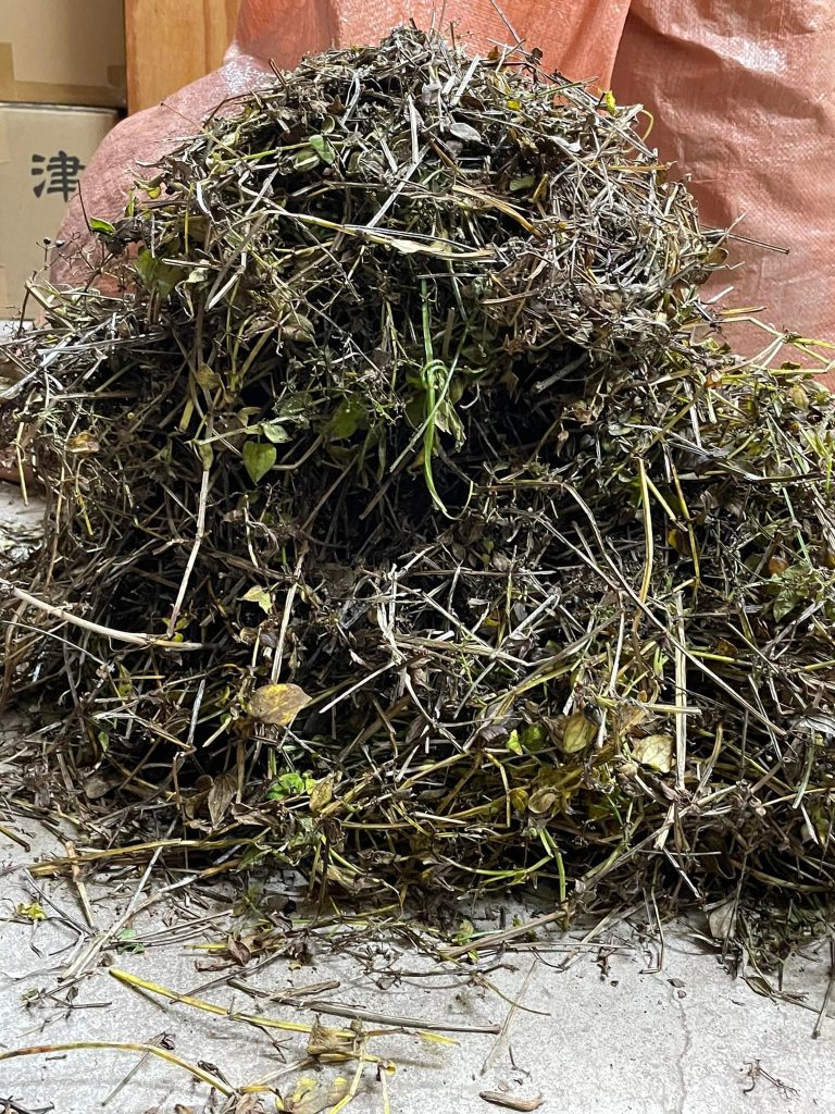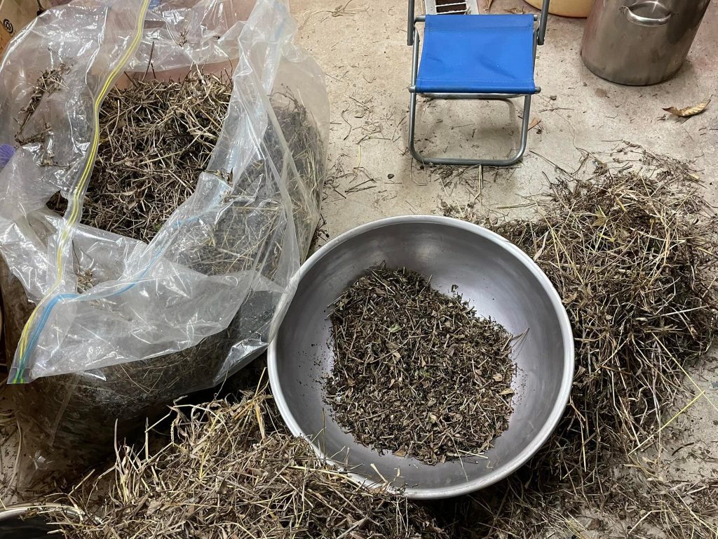 日本茜を栽培して1年が経過した畑で、日本茜の種子が付いた茎を収穫し、種子を取る選別作業をしました。